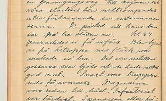 ställe närmare och med det samma tatatata kommo kulsprutorna med i leken. Det var ett särskildt ljud i dessa skott. Hårda, vilda. Här gälde att döda, skotten skrällde i öronen Bum, och sedan krevaden. Det var batteriet som började giva sina salvor skotten ljödo nu tätt på varann. – – – – – – – På en öppen plats i skogen (en myr) gjorde vi halt där stäldes i ordning för mottagning Dragonerna höggo med sina sablar till oss granriskvistar som bräddes ut på drivan en filt på och så var bädden färdig. Dr Heimbeck hade så roligt åt våra bäddar. Två hästar tjänst gjorde som ambulans vagn och körde sårade till gården. Dr och jag med några dragoner gingo upp på en höjd därifrån vi kunde se Lenkipohja by. – – – – Ja den sågo